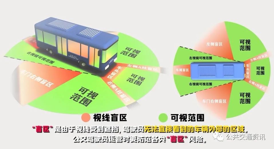 “盲區(qū)”是由于視線受到遮擋,駕駛員無(wú)法直接看到的車輛外部的區(qū)域。公交駕駛員運(yùn)營(yíng)時(shí)要防范各類“盲區(qū)”風(fēng)險(xiǎn)。