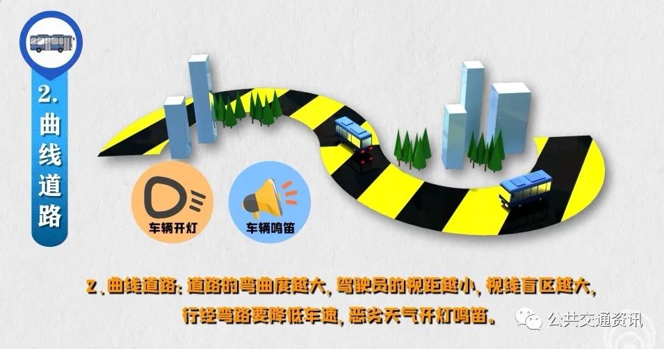 2、曲線道路:道路的彎曲度越大,駕駛員的視距越小,視線盲區(qū)越大,行經(jīng)彎路要降低車速,惡劣天氣開燈鳴笛。