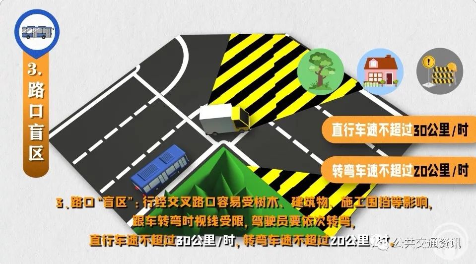 3、路口“盲區(qū)”:行經(jīng)交叉路口容易受樹木、建筑物、施工圍擋等影響,跟車轉(zhuǎn)彎時(shí)視線受限,駕駛員要依次轉(zhuǎn)彎,直行車速不超過(guò)30公里/時(shí),轉(zhuǎn)彎車速不超過(guò)20公里/時(shí)。