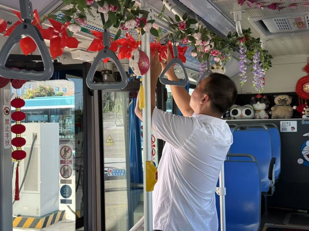 張峻峰是荊門公交2024年度“最美公交人”,他的車上總比別人多點(diǎn)“暖心”東西:駕駛座旁的小盒子里備著暈車藥、創(chuàng)可貼和折疊傘。“今年國(guó)慶,就想乘客上車能樂呵樂呵?!庇谑菑埦寰蛣?dòng)了裝飾車廂的念頭。他自費(fèi)買了小國(guó)旗、風(fēng)車、燈籠等裝飾,晚上在家剪剪貼貼,白天利用休息時(shí)間在車上裝飾。張峻峰的行動(dòng),也是荊門公交服務(wù)提升的一個(gè)縮影。