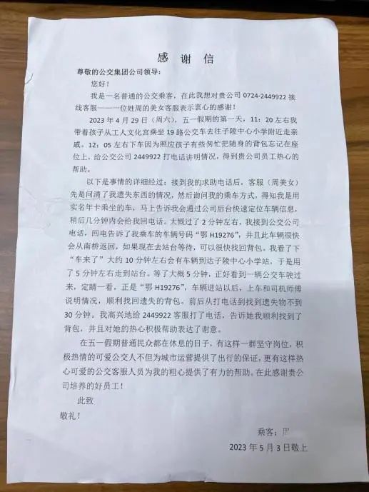 5月4日,小雨,一位熱心乘客走進(jìn)了荊門市公共交通集團有限公司客服中心,送來一封溫暖的感謝信。信中,她向“五一”節(jié)假日期間堅守崗位、積極熱心的公交人表達(dá)了濃濃謝意,紙短情長,字里行間流露出款款真情。
