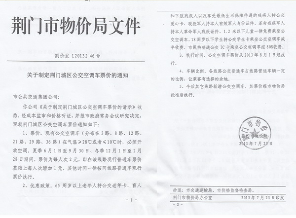 根據(jù)荊門市物價(jià)局《關(guān)于制定荊門城區(qū)公交空調(diào)車票價(jià)的通知》(荊價(jià)發(fā)[2013]46號)及《關(guān)于制定荊門城區(qū)2路等11條線路新增公交空調(diào)車票價(jià)的通知》(荊價(jià)發(fā)[2013]48號),公交空調(diào)車2014年6月1日至9月30日營運(yùn)時(shí)段內(nèi)執(zhí)行2元/人次票價(jià),現(xiàn)就執(zhí)行公交空調(diào)車票價(jià)后的有關(guān)事項(xiàng)公告如下: